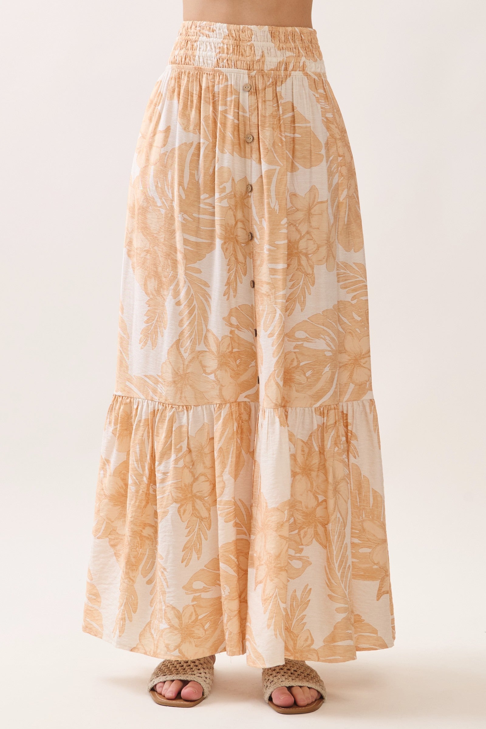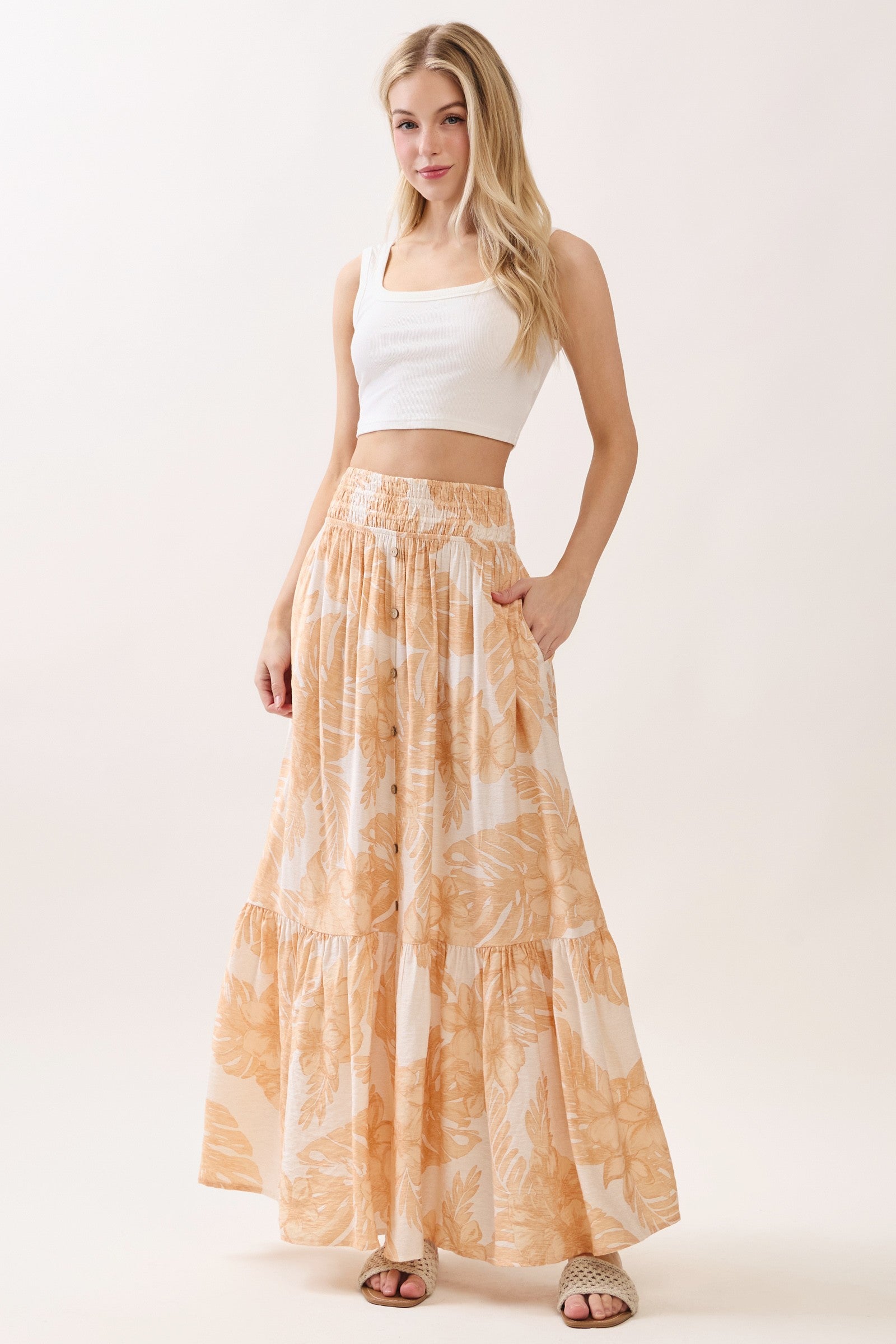 A breezy printed maxi skirt with a smocked waistband, soft ruffle tiers, and effortless movement—perfect for beach days and warm nights.