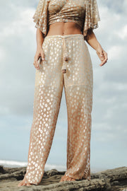 These flowy, metallic shimmer leopard pants are the perfect blend of bold and effortless. Featuring side slits for movement, a comfy drawstring waistband, and functional pockets, they deliver style and ease in one chic piece. Dress them up or keep them beachy — either way, they make a statemen