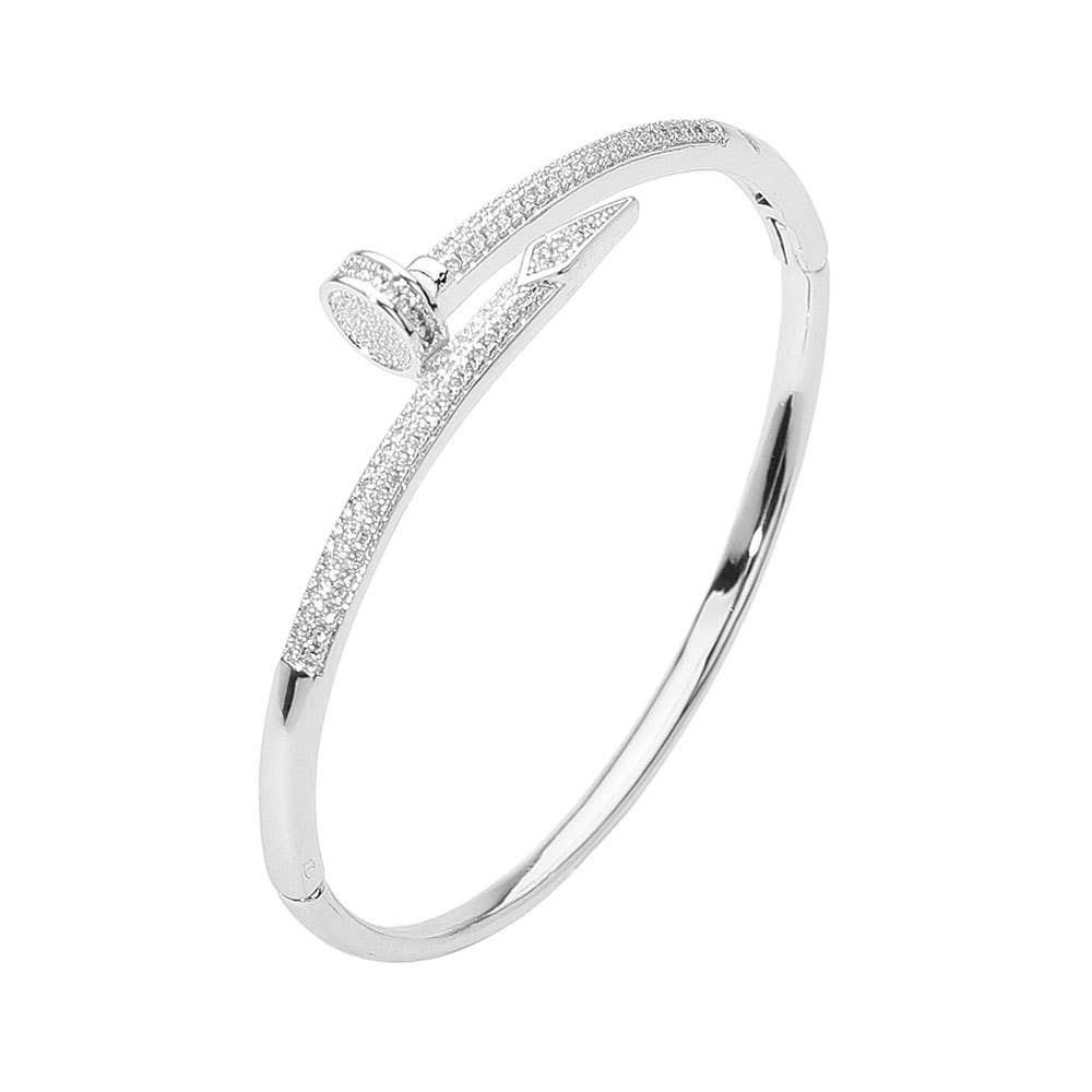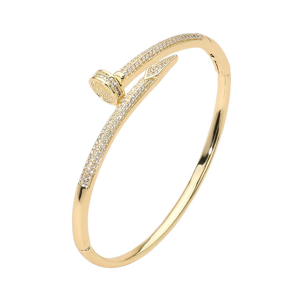 This elegant cz stone paved nailhead bangle bracelet showcases a sleek, modern silhouette accented with sparkling crystals.