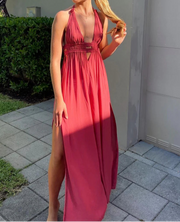 Flowy maxi dress with a deep V neckline and subtle cut-out details that enhance the silhouette. Designed in lightweight, breathable fabric, it combines effortless elegance with comfort. The emerald green shade adds sophistication, while the ruched waist and thin straps create a feminine bohemian style.