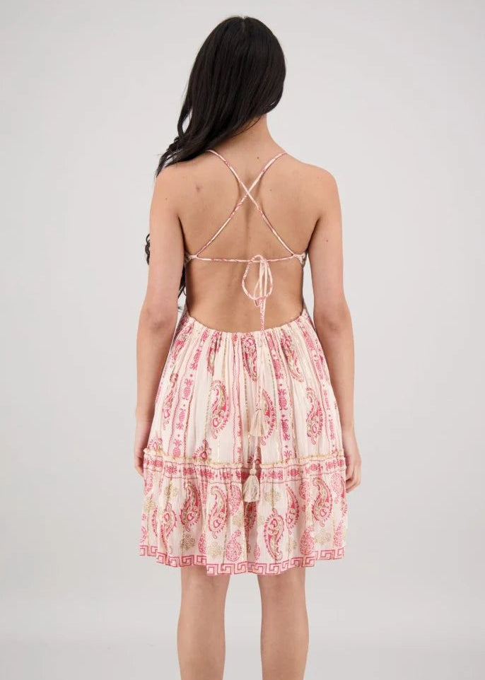 Turn heads in this mid-length boho dress, featuring a flattering open back and shimmering metallic details — perfect for effortlessly chic days and starry nights