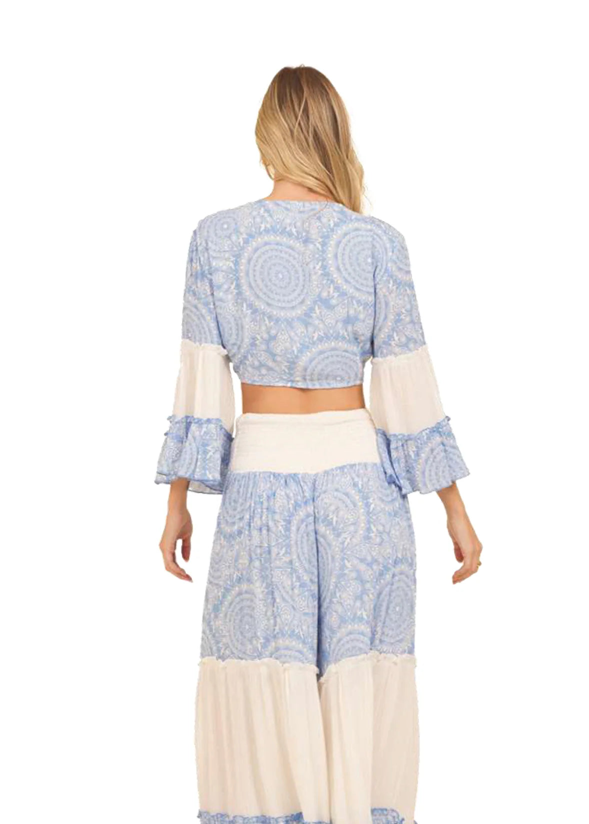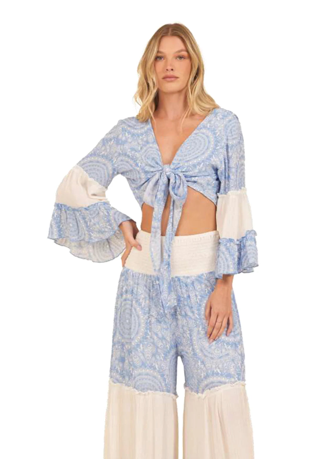 This top features flowy full sleeves, a charming paisley print, and a trendy front knot. Upgrade your beach look with this must-have piece!